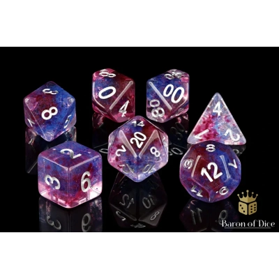 This set is created to resemble the natural element Azurite. The dice are a rich purple translucent swirled with and blue hues containing thin blue threading and inlaid with a metallic silver; premium hand-mixed resin 16mm dice set containing D4, D6, D8, D10, D10, D12, and D20.