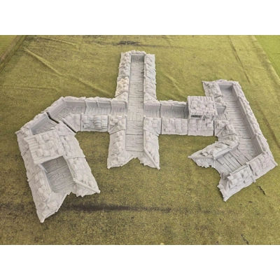 Full set containes: 1 cross piece, 1 T-piece, 3 Corners, 2 End pieces, 3 End Rubble Pieces, 4 Straights & 2 Bunker Pieces.